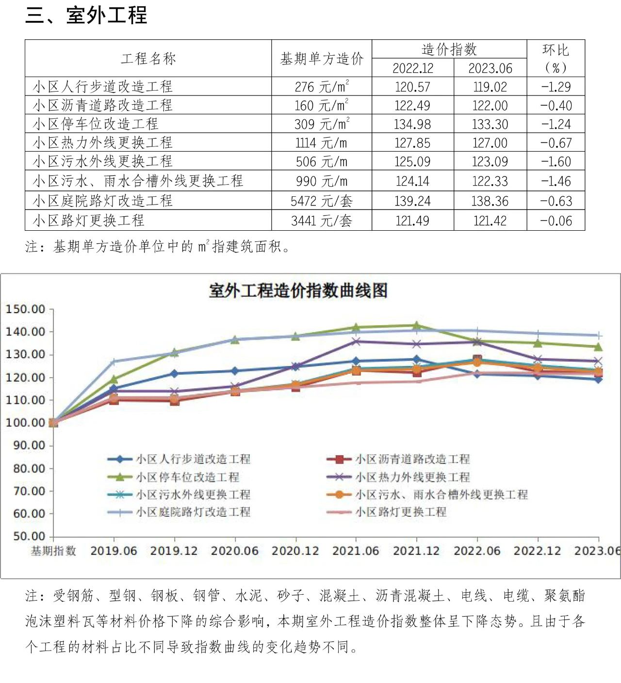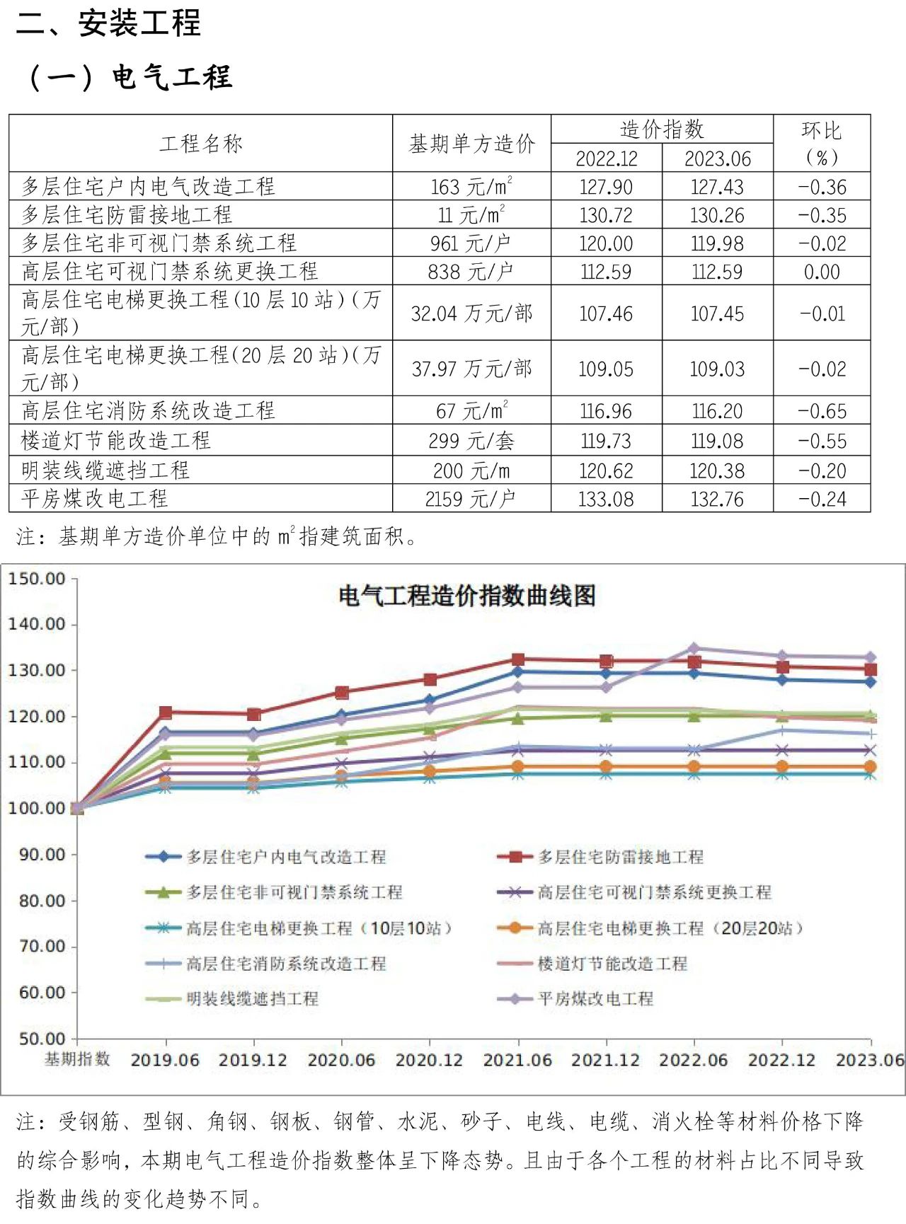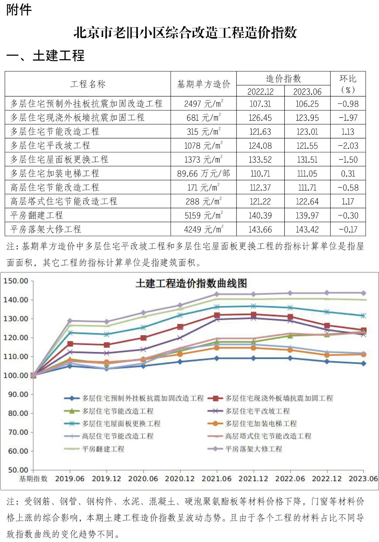为贯彻落实《关于全面推进城镇老旧小区改造工作的指导意见》(国办发〔2020〕23号)要求,加强对老旧小区整治工程造价的动态指导,为合理确定和有效控制工程造价提供参考,现发布第十二期北京市老旧小区综合改造工程造价指数。本指数在《北京市老旧小区综合改造技术经济指标》(2017)的基础上进行测算,以2016年9月为基期,2017年12月为第一期,之后每半年发布一次。2016年9月的基期造价指数为100,本期人工、材料、机械等价格按2023年6月的《北京工程造价信息》(房屋修缮工程)确定,未包括的材料价格参照同期市场价。