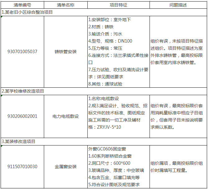 4.综合单价组价不规范,存在组价错误、漏项等问题。建设单位违反《建设工程工程量清单计价规范》第5.2.3“分部分项工程和措施项目中的单价项目,应根据拟定的招标文件和招标工程量清单项目中的特征描述及有关要求确定综合单价计算。”之规定。