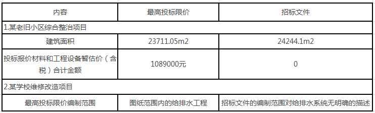 5.最高投标限价相应子目与招标文件规定自相矛盾。最高投标限价项目名称、建筑面积、计价内容等与招标文件规定自相矛盾。