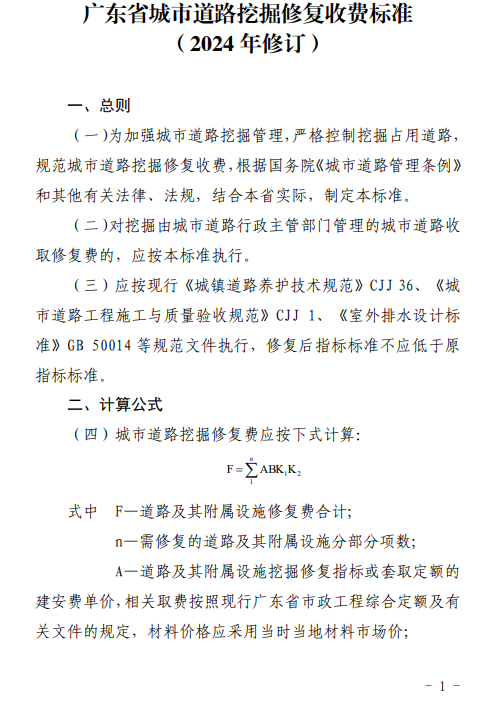 广东省住房和城乡建设厅关于印发《广东省城市道路挖掘修复收费标准(2024年修订)》的通知