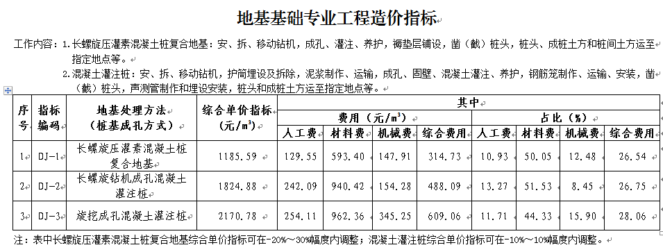 一、《地基基础专业工程造价指标(试行)》(以下简称本指标)主要适用于房屋建筑工程中的长螺旋压灌素混凝土桩复合地基和混凝土灌注桩专业工程,可作为投资控制和工程招标时确定专业工程暂估价的参考。