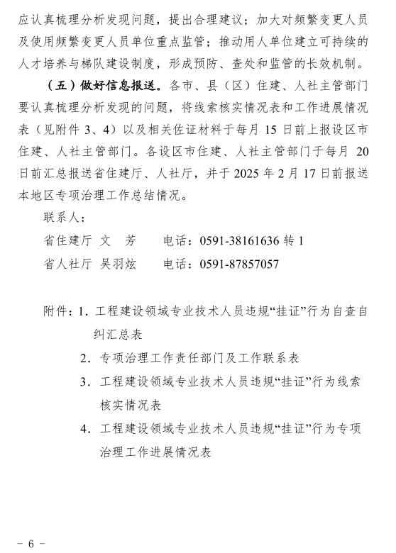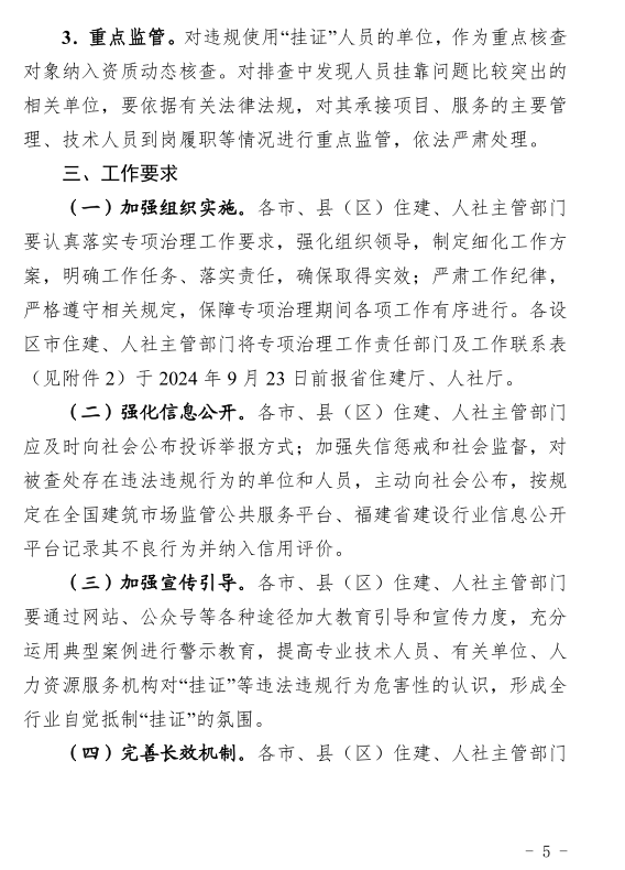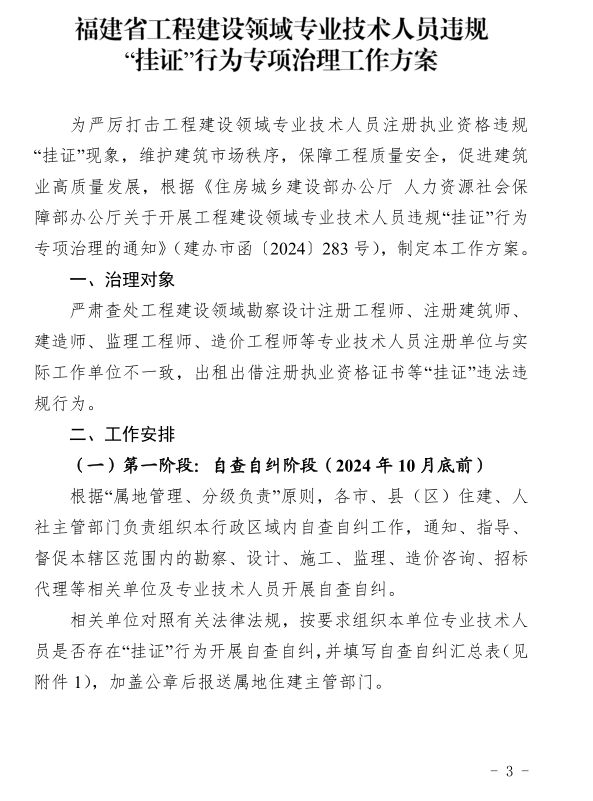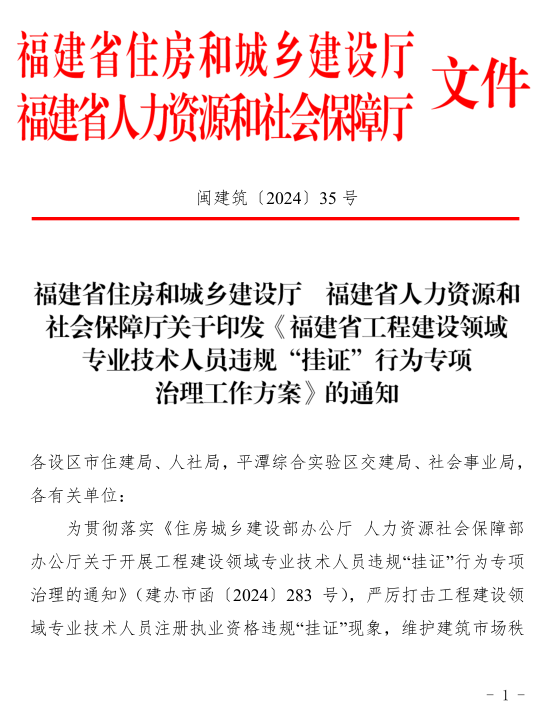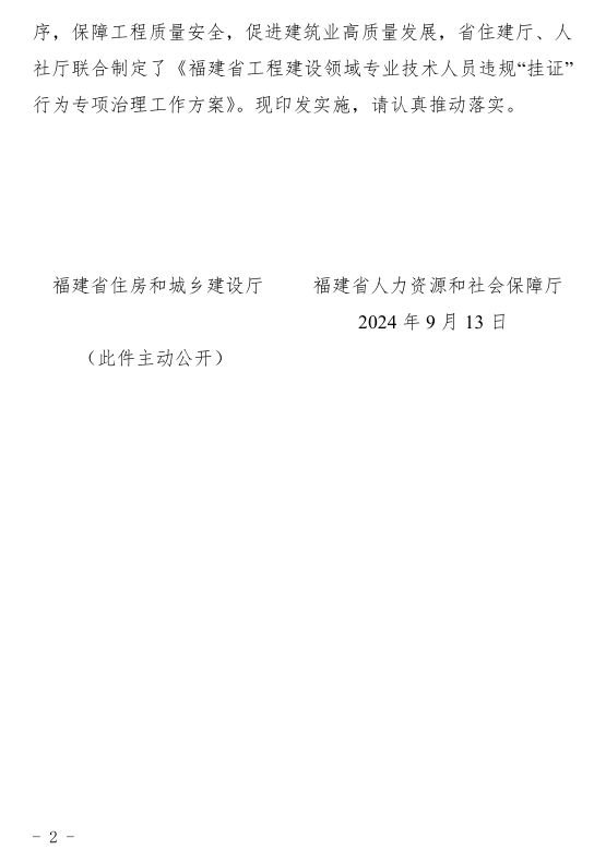 福建省住房和城乡建设厅、省人力资源和社会保障厅联合发布关于印发《福建省工程建设领域专业技术人员违规“挂证”行为专项治理工作方案》的通知