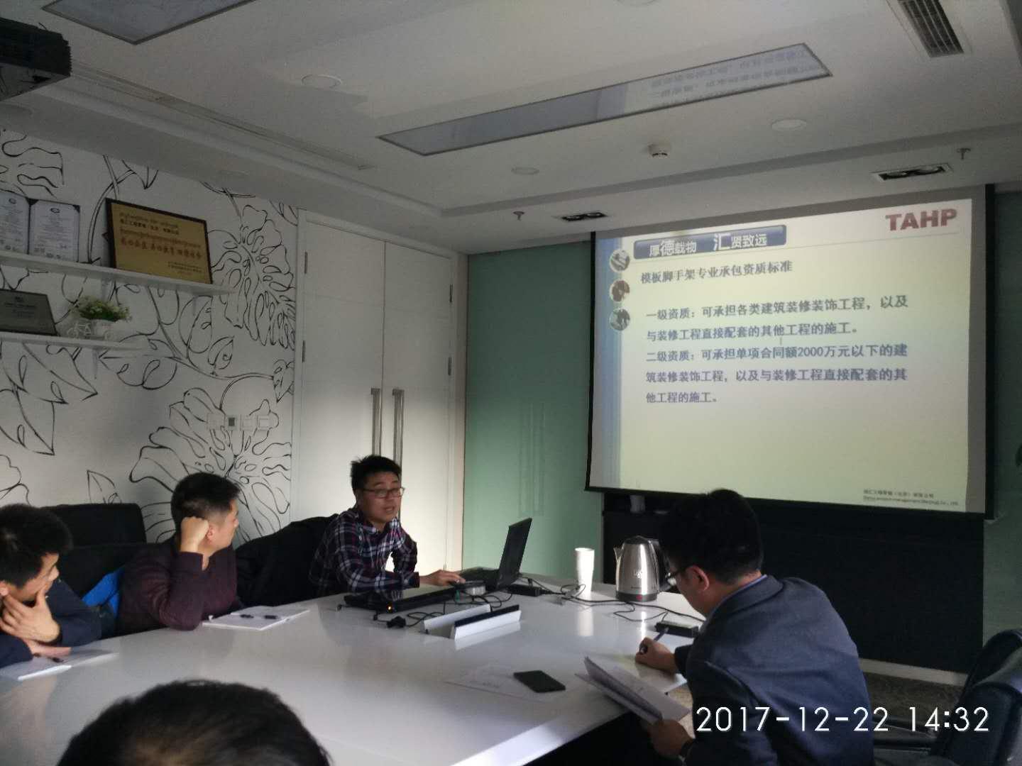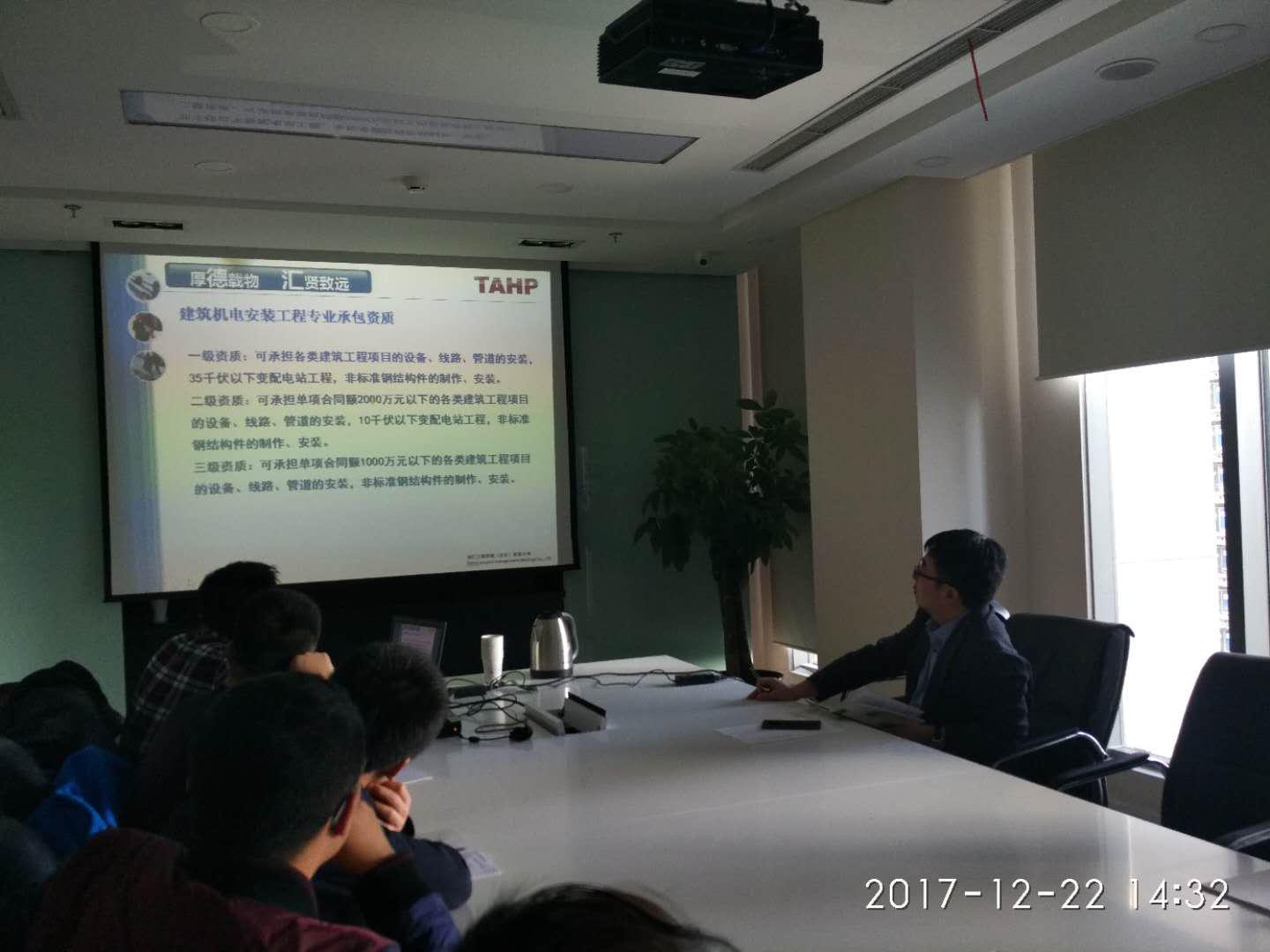 2017年12月22日下午,工程部在公司大会议室进行了第三次业务培训,由崔红强主讲了《精装修施工应注意的事项》。崔工结合我公司的多个精装修项目工程实例和多张现场实景照片,讲解了精装修施工中应该控制的关键点及设计与施工过程中管控的要点,难点及应注意的事项。