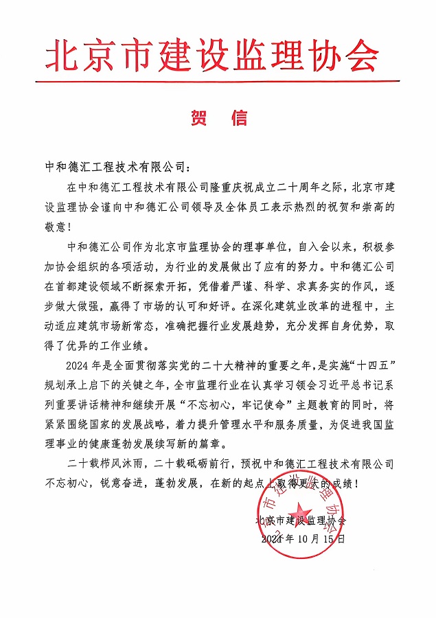 2024年10月15日,正值米兰官方端网页版成立20周年之际,公司收到了北京市建设监理协会的贺信。这封贺信不仅对公司过去20年砥砺奋进和卓越成就的认可,更是对我们未来发展的美好祝愿。在这个重要的时刻,我们谨向所有关心和支持我们的朋友及行业协会表示最诚挚的感谢。您们的支持和信任是我们不断前进的动力。