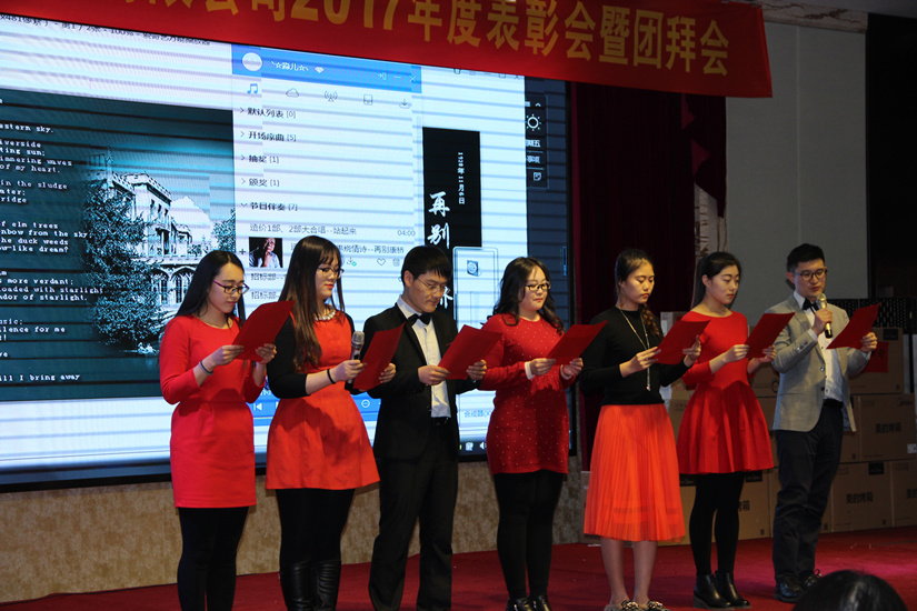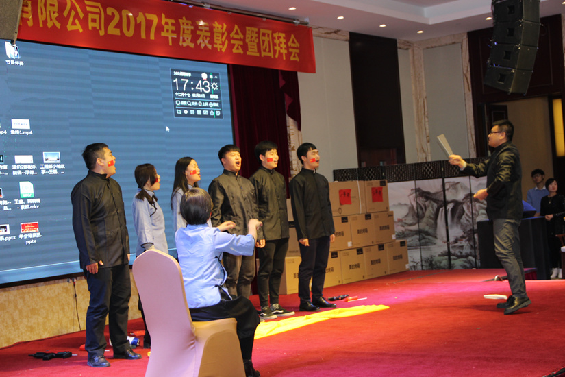 年会上,在公司高管进行了热情洋溢的诗朗诵表演后,主持人宣布年会开始,随后,王维东总经理发表了新年致辞,勉励各部门员工在2017年双亿佳绩的基础上再接再厉,并衷心感谢大家多年对德汇公司事业的鼎力支持;段少佐副总经理宣读了2017年优秀员工表彰通报,并对2017年度优秀员工进行了颁奖,李红飞代表优秀员工发言,表达了继续为公司勤恳工作的决心;造价一部二部全体100余位员工共同演唱了《站起来》,提振了整个年会的气势和气氛,各部门陆续带来精彩纷呈的表演;最后,詹芙蓉董事长发表了祝酒词,晚宴正式开始,在晚宴进行过程中,穿插了紧张刺激的抽奖环节,将晚宴一次又一次推向高潮。