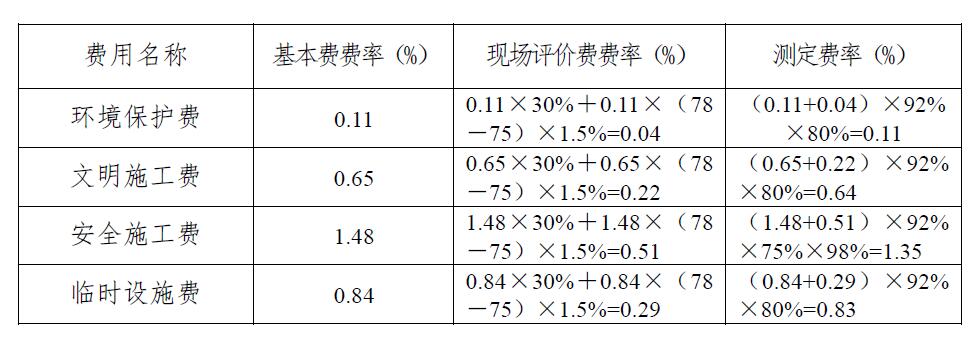 最终综合评价得分为75~80分(不含80分)者,计取安全文明施工现场评价费,现场评价费费率=基本费费率×30%+基本费费率×(最终综合评价得分-75)×1.5%。
