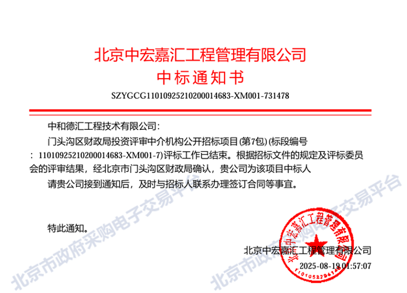 此次中标标志着公司正式纳入门头沟区财政局投资评审中介机构库,获得了参与政府财政投资评审项目的专业资格,为今后持续承接政府类项目奠定了坚实基础。