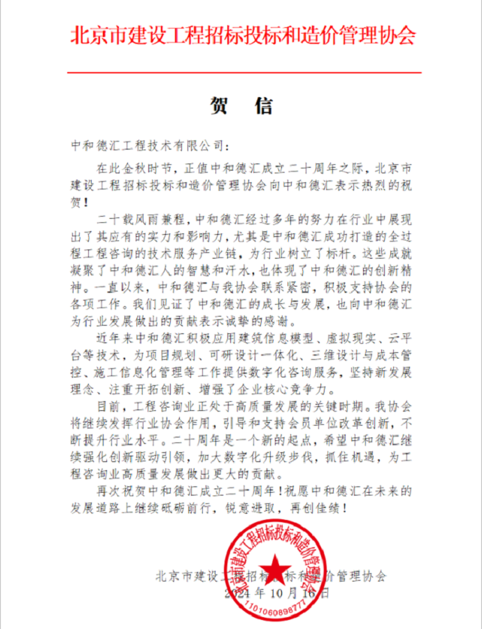 2024年10月16日,正值米兰官方端网页版成立20周年之际,公司又收到了北京市建设工程招标投标和造价管理协会的热烈祝贺。这封贺信不仅是对我们过去20年辛勤付出和卓越成就的肯定,更是对我们未来发展提出了更高的期望。我们将全力以赴在京标价协工作指导下,积极参与行业合作,提升技术创新能力,为业主提供更加优质的服务,共同为推动工程咨询行业的健康发展贡献力量。