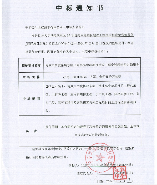 2024年3月,我司造价板块在(良乡大学城拓展东区10号地高中部项目)竞标中,凭借扎实高效的工作作风,雄厚的技术力量和良好的企业信誉,以绝对优势中标。